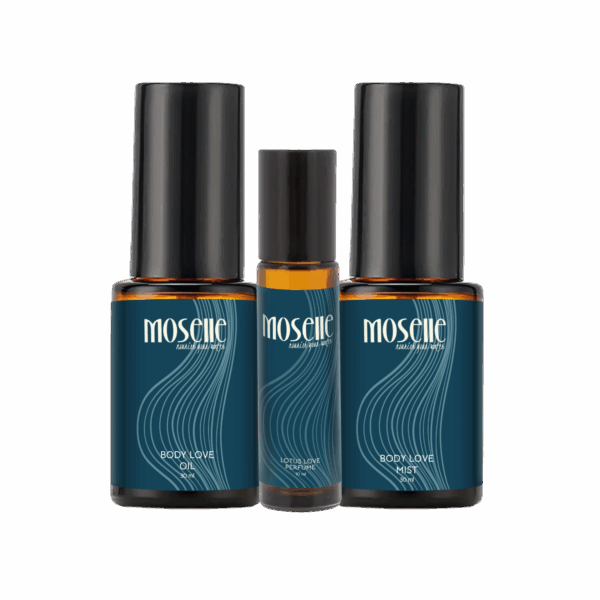 The set includes a 30ml Body Love Oil, 30ml Lotus Love Mist, and a 10ml Lotus Love Perfume — a refined trio of decadent aromatic expressions, each carrying the same signature Moselle scent of blue lotus, ylang ylang, and tuber rose, in distinct and sensorial applications.